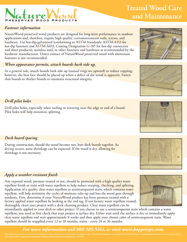 Learn about how to care for and maintain NatureWood’s treated wood products. Inculing deck board spacing and applying weather-resistant finishes.
